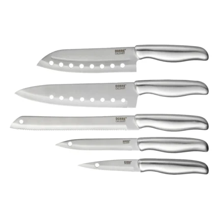 Calgary Messerset 5 Stück5 scharfe Qualitätsmesser von Dorre, die Ihnen in der Küche zum Erfolg verhelfen. Das Calgary-Messerset besteht aus einem japanischen Messer, einem Kochmesser, einem Brotmesser, einem Allzweckmesser und einem Schälmesser.