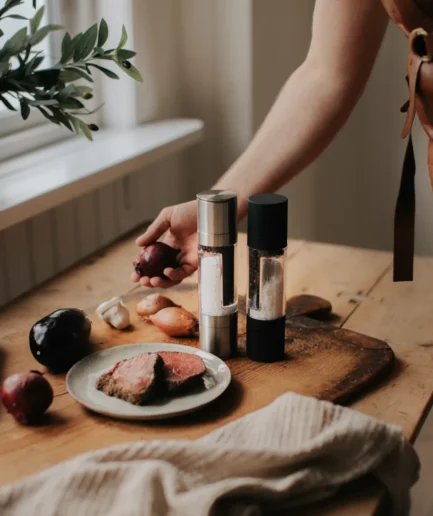 Weiß, klassisch gestaltete Holzmühle für die Küche. Mahlen Sie Salz und schwarzen Pfeffer direkt auf Ihr Essen mit der Karou Pfeffer/Salzmühle für den besten Geschmack.