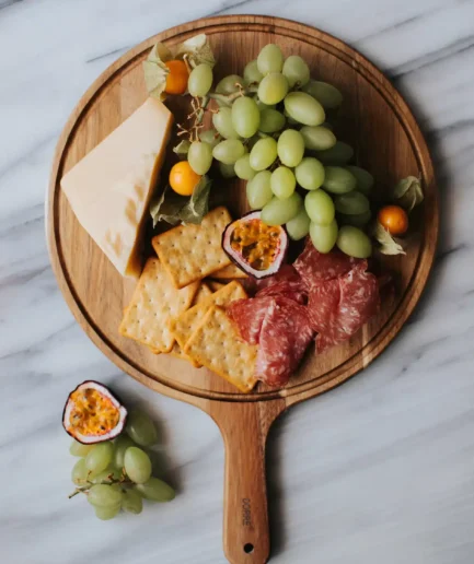 Sonja Akazienholz-Schneidebrett ist ein ovales Schneidebrett, das Sie für die Präsentation von Snacks bis hin zu Käseplatten verwenden können.